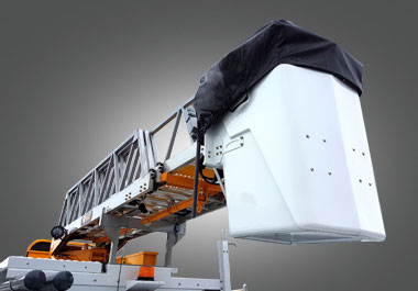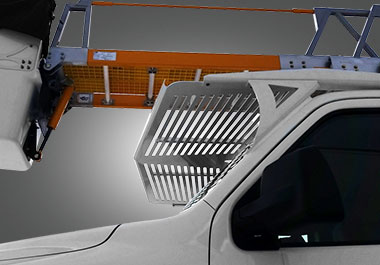 Un protège pare-brise monté sur un Nissan pour prévenir contre l'éventuelle chute de débris lors d'utilisation de l'échelle aérienne.
